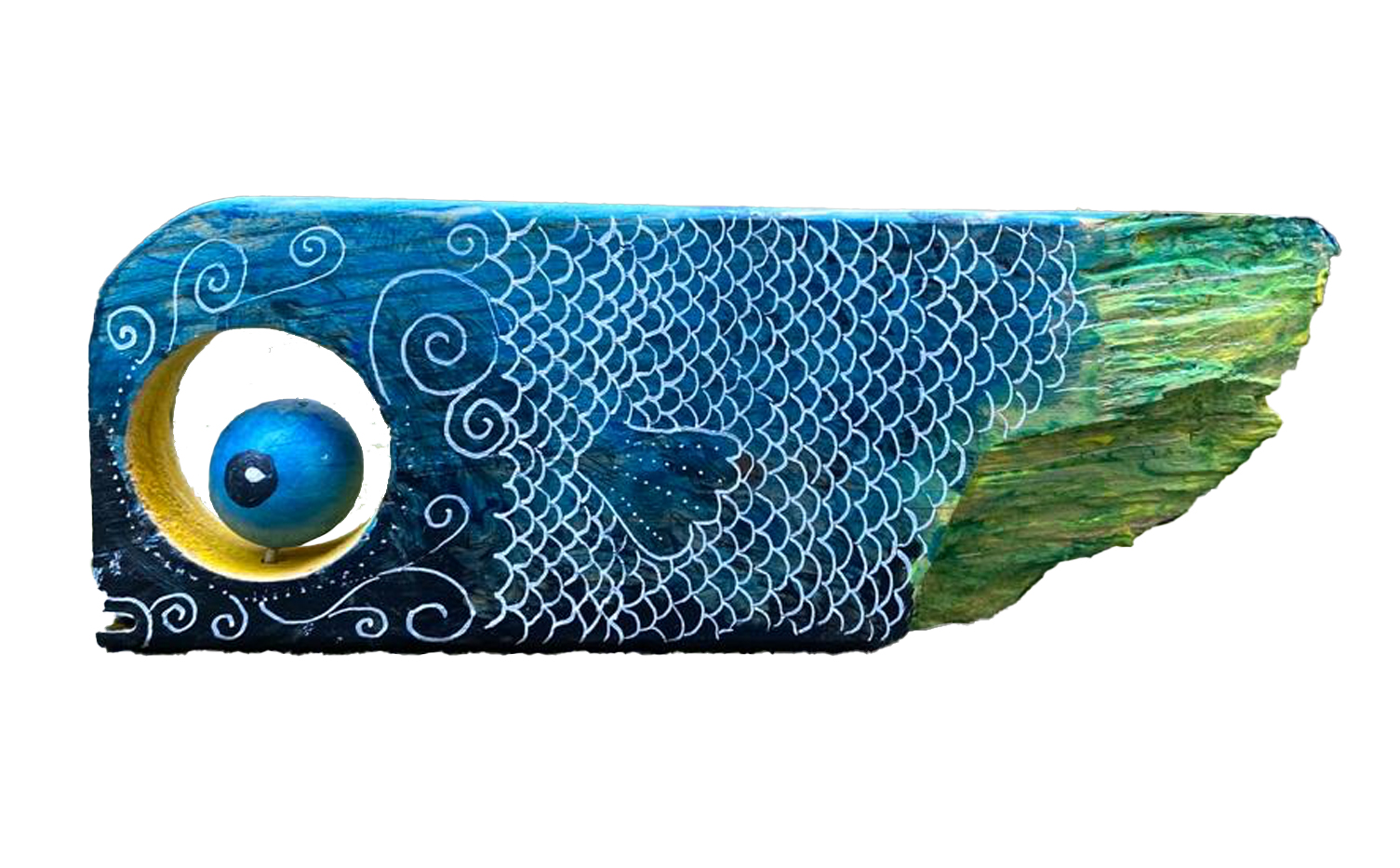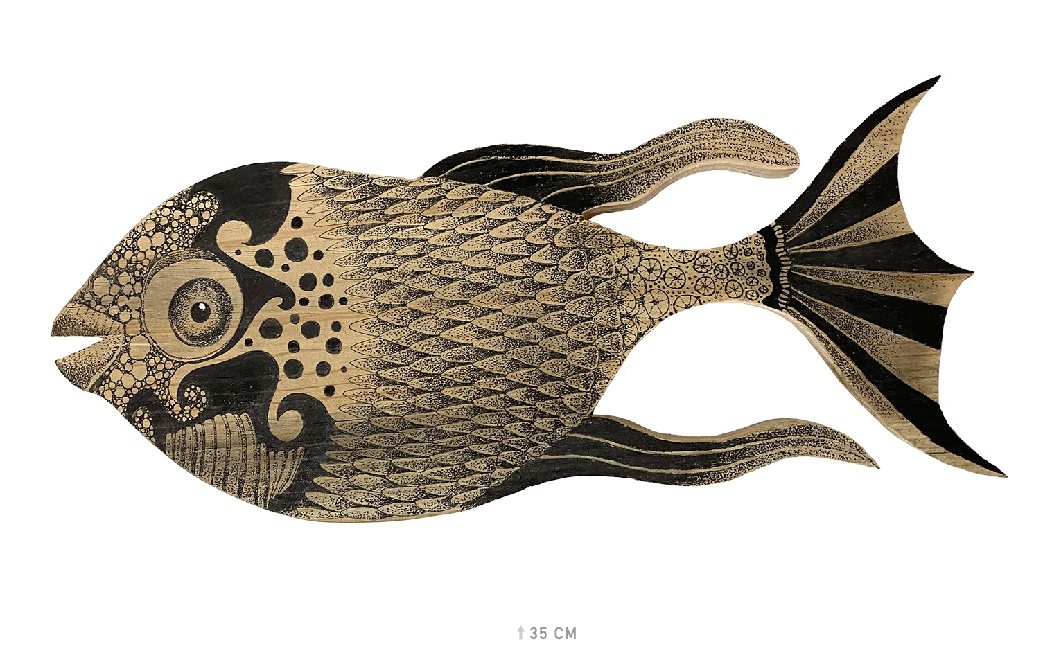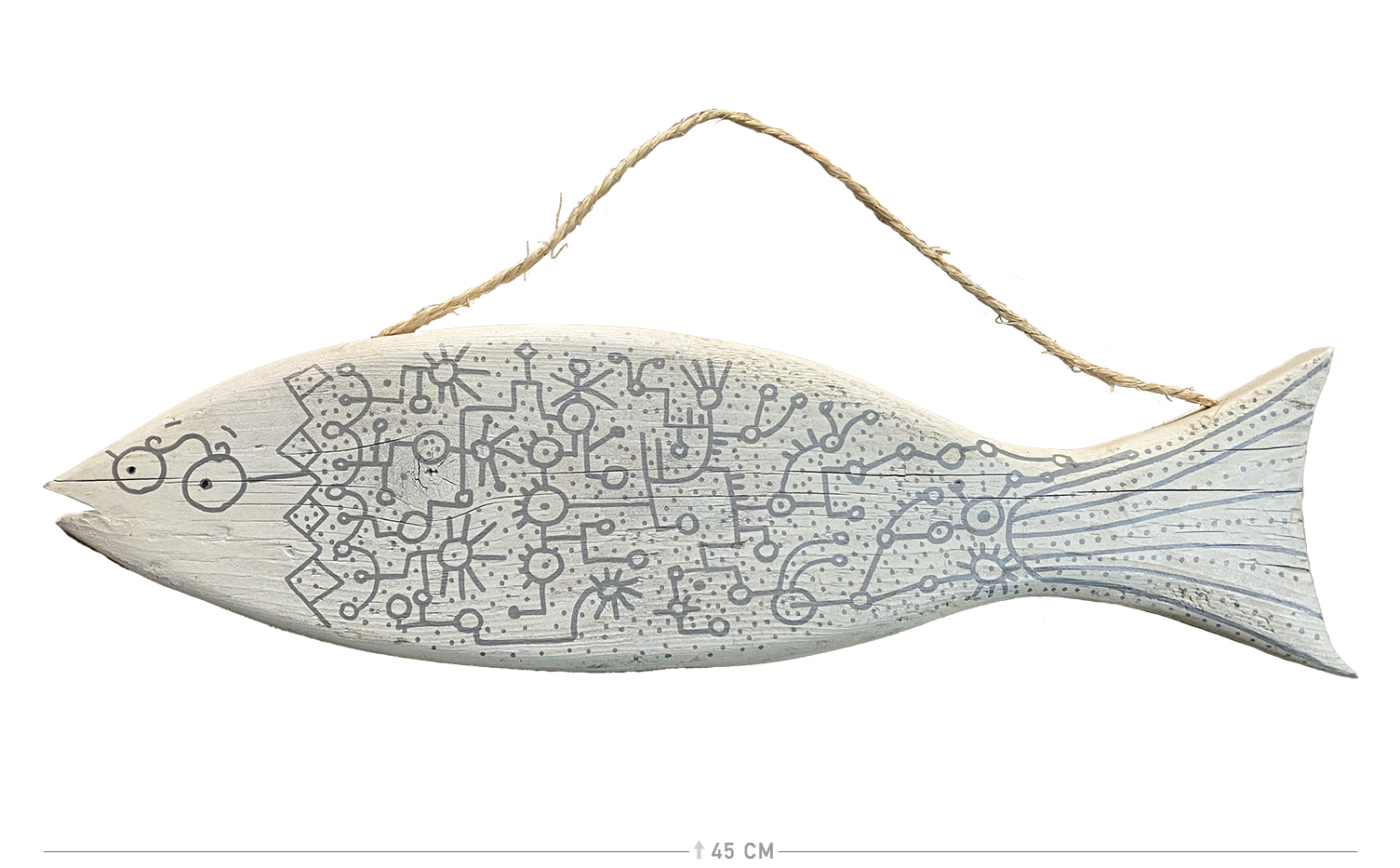 Cada tabla sugiere un pez, no hay plan, solo intuición. El gesto viene luego, corriendo atrás de la sierra y la lija, mientras los colores se inventan solos y las lineas juegan a su antojo.